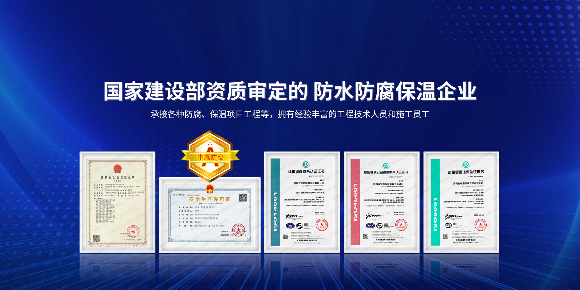 公司經營范圍:防水防腐保溫工程;消防設施工程;建筑裝修裝飾工程;建筑機電安裝工程;電力工程;建筑工程;石油化工工程;工業清洗工程;油罐清洗工程;鋼結構工程;環保工程;模板腳手架工程;電纜防火封堵、防污閃噴涂、外墻外保溫工程;各類施工勞務作業;設備維修、船舶鉚焊、涂裝;電力工程材料、建材、防水材料、防火材料、防腐保溫材料銷售,并相繼通過了GB/T19001-2008idtISO9001:2008GB/T50430-2007質量管理體系認證證書。GB/T24001-2004idtISO14001:2004環境管理體系認證證書。GB/T28001-2011idtOHSAS18001:2007職業健康安全管理體系認證證書。公司是中國防腐蝕于防護協會、中國施工企業管理協會、電力協會和中國鋼結構防水協會會員單位。 公司的經營業務涵蓋了石油、化工、電力、冶金、煤炭、船舶、國防、燃氣、水利、環保、交通運輸、航空及國防軍工和輕紡市政等行業的防腐保溫絕熱設備。鋼結構安裝、防火、防水、金屬噴鍍、聚脲噴繪、陰極保護、防滲透堵漏、玻璃鋼及各種磚版材料襯里、橡膠襯里、煙氣硫和耐酸溶劑腐蝕等工程施工。公司連續十年榮獲“省市先進施工企業”“安全生產先進單位”“重合同,守信用企業”和“AA***資質企業”的稱號。2000年被命名為市級文明單位,2002年被國家工商行政管理局命名為“重合同,守信用的企業”、被中國工業防腐蝕技術協會命名為“防腐蝕企業,能源節約及環境保護領域有豐富的經驗和***的業績。工程一次交驗合格率100%。其中攀枝花鋼鐵公司煉鐵廠四號高爐及熱風爐防腐工程、上海寶鋼公司煤氣柜防腐工程、撫順石油一廠裝置防腐項目、齊魯石化公司稀烴廠高塔防腐工程、吉林化學工業公司煉油廠油罐防腐工程、天津石化熱電廠六號爐頂棚聯絡管保溫工程、大慶油田(太倉)力神泵業工程、中國化學工程第十一建設工程、中原油田勘探局工程、中國石化銷售有限公司華北分部、魯皖輸油管道工程、貴州開磷息烽合成氨工程、陜西黃陵煤化工程、中國石油天然氣西部管道塔里木輸油工程、邯鋼集團邯寶鋼鐵公司煉鐵工程、德州供電工程、吉寶(南通)船廠工程,偃師華潤熱力工程、鄭州熱力總公司。 河南省中惠防腐安裝有限公司愿以豐富的施工經驗,***的技術,***的設備,***的管理,***的服務,竭誠為國內外廣大的用戶提供***滿意、******的工程作品。 我公司愿與國內外同仁一道,團結協作,共同推進防腐蝕行業發展! 公司地址:河南省長垣縣建設路北段360號 固定電話:0373-8866488 郵編:453400 網址:http://www_zhff_com_cn.annnk.com